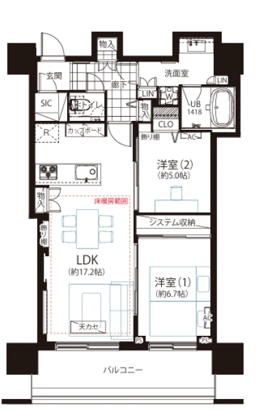 | 設備 | システムキッチン、食器洗浄乾燥機、追焚機能、トイレ、バス・トイレ別、シャワー、洗面所、洗面台、室内洗濯機置場、浴室乾燥機、エアコン、床暖房、照明器具付き、収納スペース、シューズインクローゼット、エレベータ、宅配ボックス、コンシェルジュサービス、オートロック、【新規内装済】 | ||