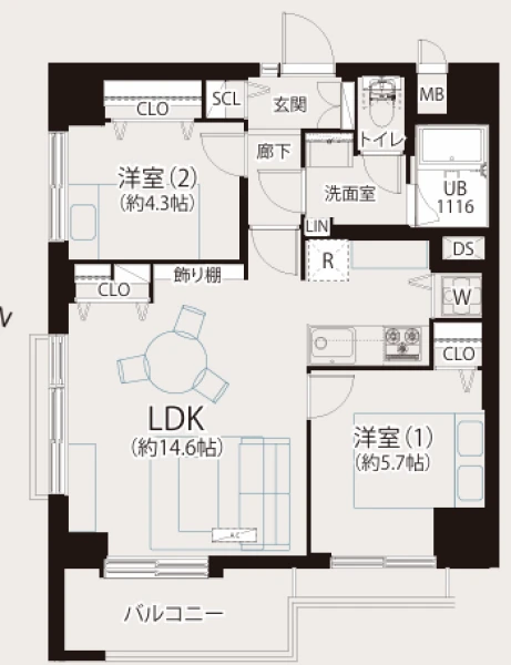 | 間取り | 2LDK | 間取り向き | (角部屋) |