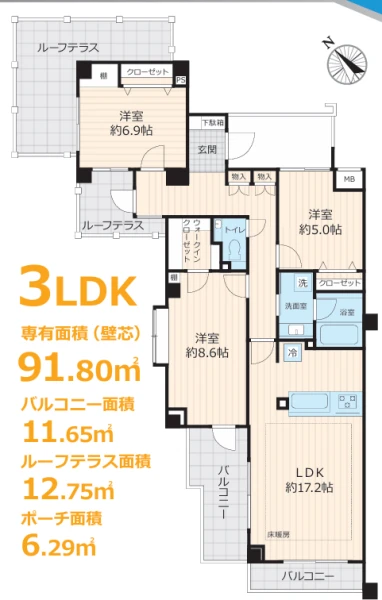 | 専有面積 | 91.8㎡(壁芯) | 建物構造 | 鉄筋コンクリート(RC) |