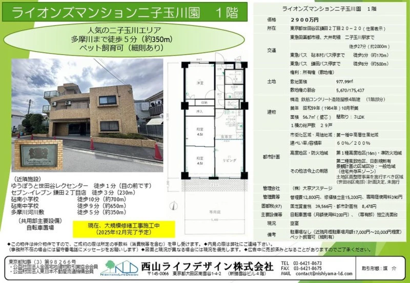 | 所在地 | 東京都世田谷区鎌田2丁目20-20 ライオンズマンション二子玉川園 | ||