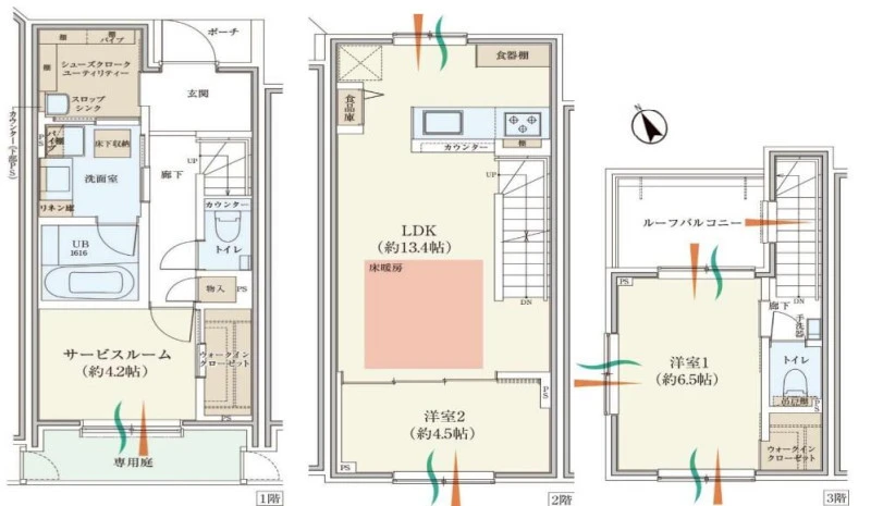 | 設備 | 都市ガス、システムキッチン、カウンターキッチン、バス・トイレ別、エアコン、ルーフバルコニー、専用庭、◆ルーフバルコニー面積 5.58㎡(約1.68坪) ◆専用庭面積 4.92㎡(約1.48坪) | ||