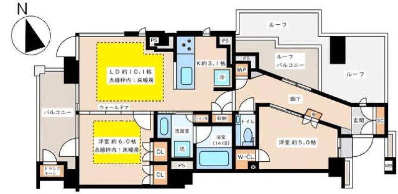 | 設備 | 都市ガス、システムキッチン、浄水器、食器洗浄乾燥機、ディスポーザー、給湯、追焚機能、温水洗浄便座、シャンプードレッサー、室内洗濯機置場、浴室乾燥機、床暖房、ルーフバルコニー、2面バルコニー、収納スペース、ウォークインクローゼット、エレベータ、宅配ボックス、ディンプルキー、オートロック、モニタ付インターホン | ||