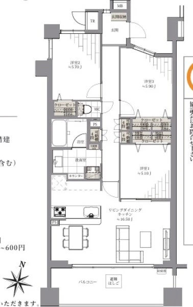 | バルコニー面積 | 13㎡ | バルコニー向き | 南 |